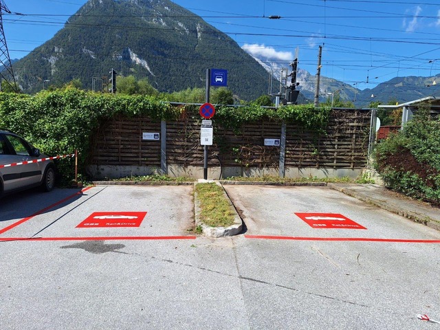 Verlassen Sie den Bahnhof in Richtung Bahnsteig Unterführung. Auf dem angrenzenden Parkplatz finden Sie die ÖBB-Fahrzeuge auf der rechten Seite.